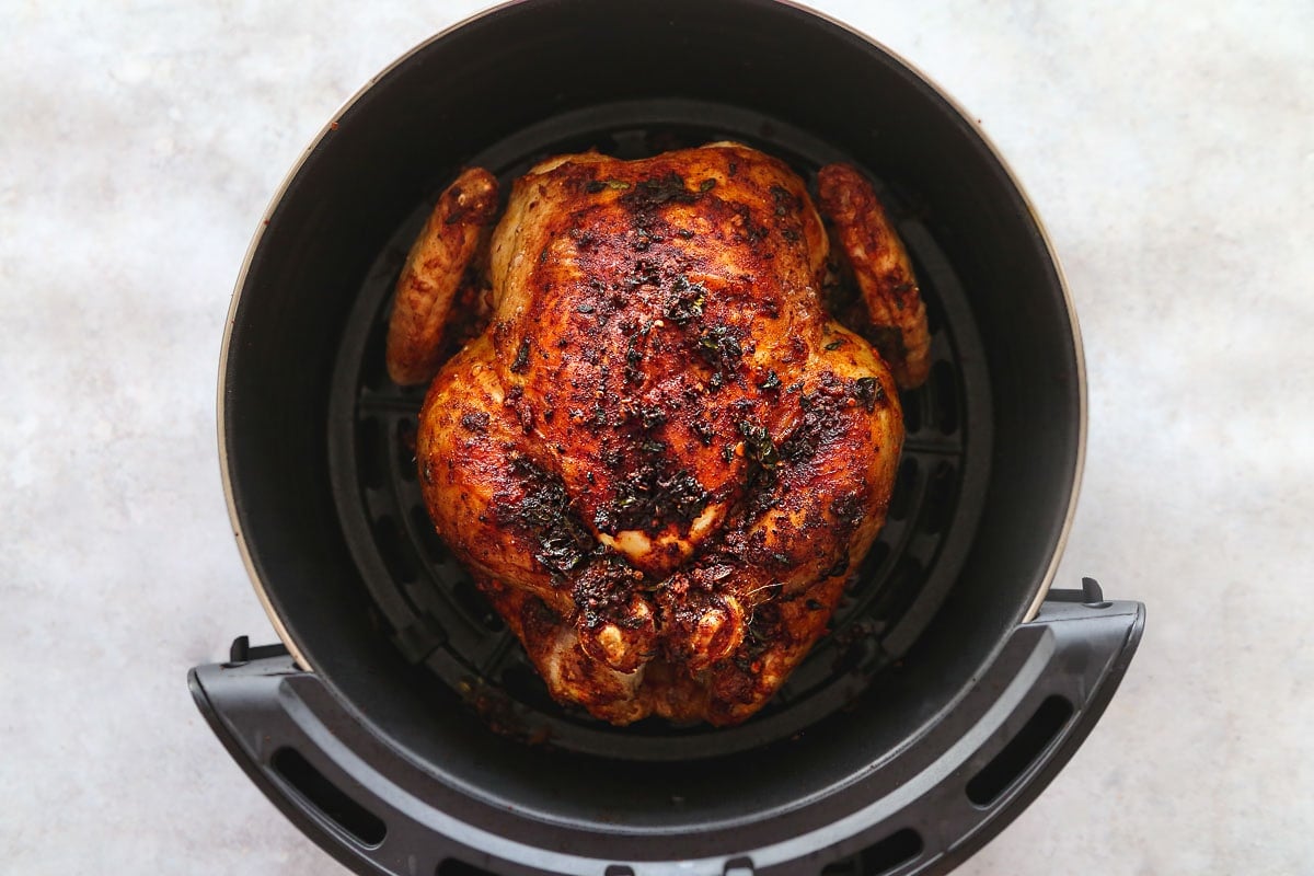If you plan to air fry, i'd err on the side of there are ways to eyeball a cooked whole chicken for doneness, but none of them are as certain place seasoned chicken in the (greased) air fryer basket, breast side down, and roast for 30 minutes.